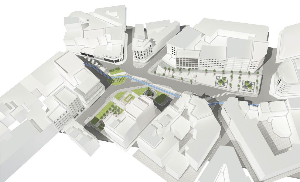 By designing this, we took into serious consideration the accessibility of each street to provide an efficient service to the city. A more proper bus stop/terminal has been provided as well. It has been integrated with a ‘shelter’ which gives more identity to the space as it hosts also, on the top of it, an elevated hardscape park. With this elevated park we achieved to combine the busy square with an intimate public space which is somehow protected by the noisy surroundings (being at the same time immersed in them) due to its higher level (+4.50m from the street sidewalk level) and trees all around.