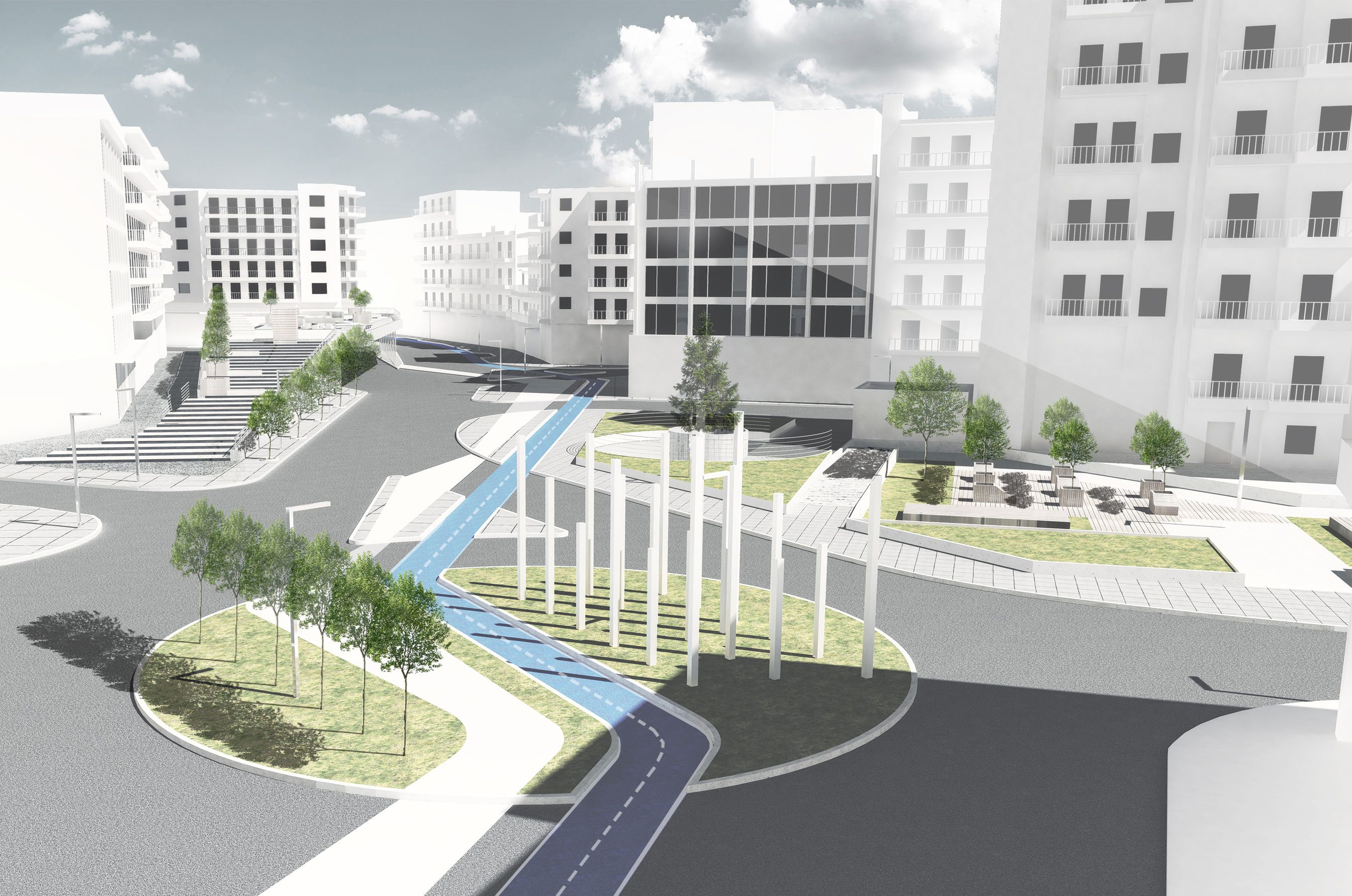 More sustainability because by having this strong element of pedestrian and bike lanes in the middle of the square, we propose a semi-pedestrianization of the whole area. Private cars are less encouraged to contribute to the traffic, public transportation buses go more efficiently, less pollution in the area, and so on.